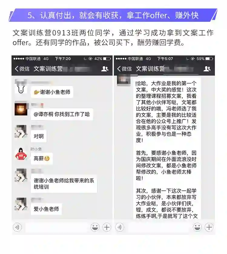 在文案训练营,通过学习,每期都有靠文案零花钱、成功转岗专职文案的同学。