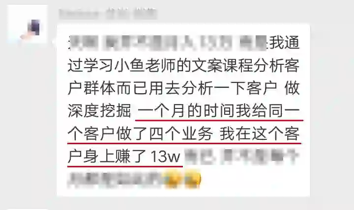 她用文案训练营里的知识,给一个客户做了4个业务。一个月赚了13w。一个月的收入,一些人一年的收入。