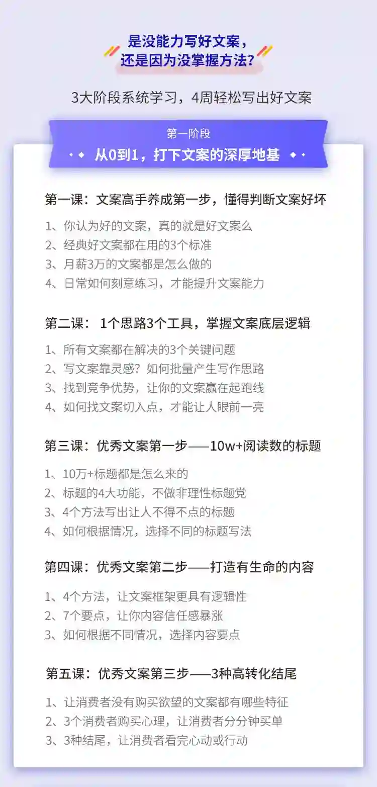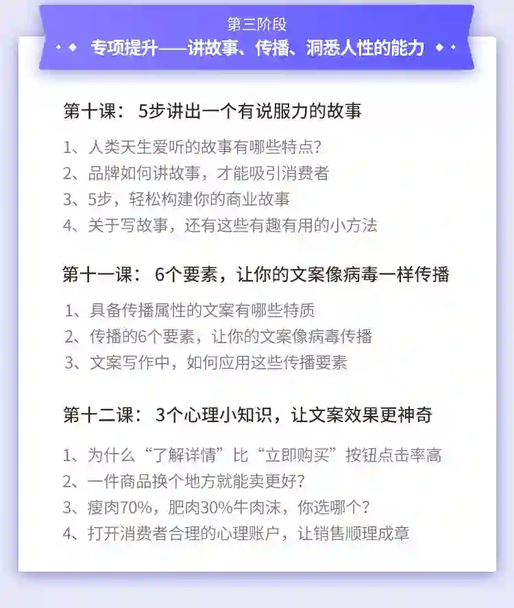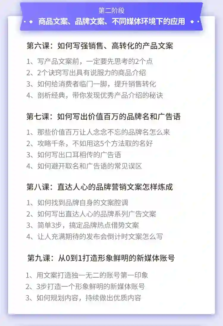 你逐步掌握: 文案的底层逻辑、标题/内容/结尾的写法/、销售文案的写法、品牌文案的写法、文案传播的要素等
