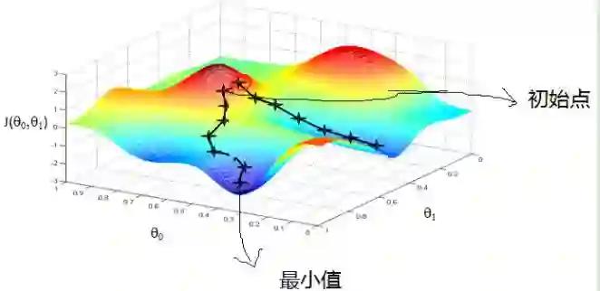 比如我们在一座大山上的某处位置,由于我们不知道怎么下山,于是决定走一步算一步,也就是在每走到一个位置的时候,求解当前位置的梯度,沿着梯度的负方向,也就是当前最陡峭的位置向下走一步,然后继续求解当前位置梯度,向这一步所在位置沿着最陡峭最易下山的位置走一步。这样一步步的走下去,一直走到觉得我们已经到了山脚。当然这样走下去,有可能我们不能走到山脚,而是到了某一个局部的山峰低处。