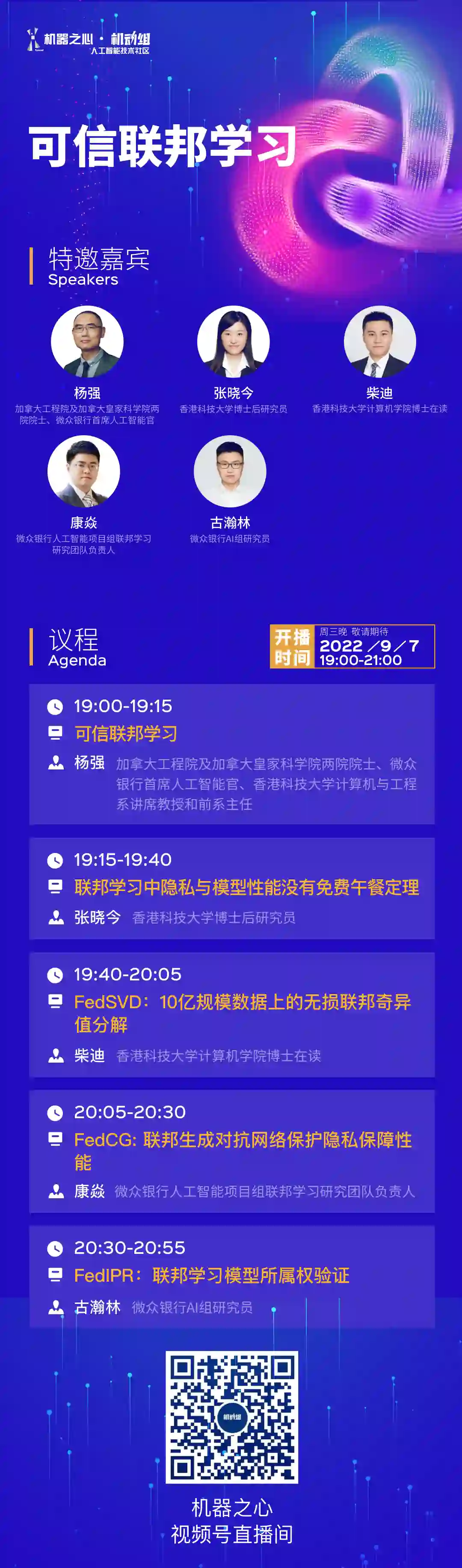 个人简介:杨强,加拿大工程院及加拿大皇家科学院两院院士,微众银行首席人工智能官,香港科技大学计算机与工程系讲席教授和前系主任,AAAI-2021 大会主席,国际人工智能联合会(IJCAI)理事会前主席,香港人工智能与机器人学会(HKSAIR)理事长,智能投研技术联盟(ITL)和开放群岛开源社区 (OI) 主席,ACM TIST 和 IEEE TRANS on BIG DATA 创始主编,CAAI,AAAI,ACM,IEEE,AAAS 等多个国际学会 Fellow。领衔全球迁移学习和联邦学习研究及应用,著作包括《迁移学习》、《联邦学习》、《隐私计算》和《联邦学习实战》等。 演讲摘要:联邦学习是人工智能和隐私计算的重要交集。如何使联邦学习更加安全可信和高效是今后产业和学界关注的重点。杨强教授在讲座中将系统回顾联邦学习的进展和挑战,并展望几个重要发展方向。 论文一:联邦学习中隐私与模型性能没有免费午餐定理