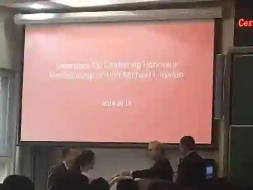 北京大学副校长田刚院士代表学校对Michael I. Jordan教授的加入表示热烈欢迎,并为其颁发了北京大学名誉教授的聘书。学生代表吴凡为Jordan教授佩戴北大校徽。授予仪式由数学科学学院院长陈大岳教授主持。