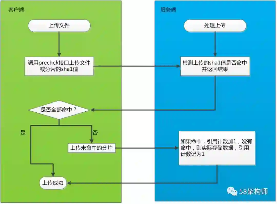 针对以上情况,我们设计了WOS“秒传”功能,给客户端提供的sdk中增加precheck接口,同时在服务端增加引用计数功能,具体方案如下: