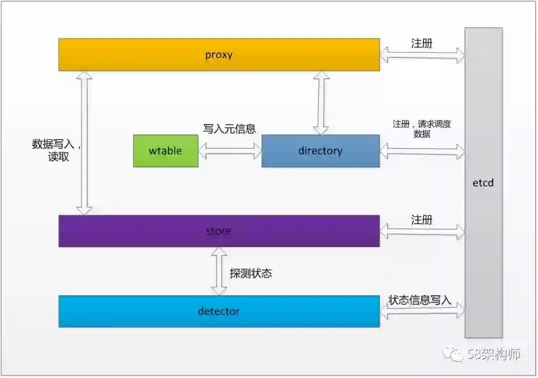 Directory是wos的中枢模块,负责文件元信息的存储以及数据的智能调度功能。Directory同样无状态,易于横向扩展,文件元信息存储在58自研的分布式kv存储系统wtable中。写请求到来时,Directory为该请求通过调度算法分配数据将要存入的store和volume,同时,将调度信息以及文件元信息存入wtable;读请求到来时,directory根据文件查找数据存入的store及volume并交给proxy进行后续处理。