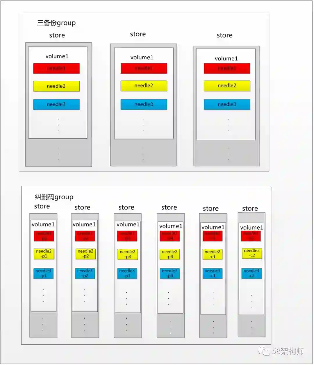 我们保持原有的存储结构,还是用group来管理store,三备份下一个group管理3个store,每个store中存放一份needle的副本,纠删码情况下,我们以4+2编码为例,一个group下管理6个store,同时这6个store管理的volume标识为EC类型,每个store存放原needle的一个分片和2个新产生的编码分片,6个分片分别放到每个store的同样编号的volume中,在分片的头部字段标识身份。这样,我们将存储空间从3倍缩减到1.5倍,整体存储结构如下图所示: