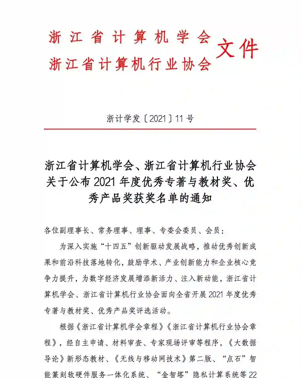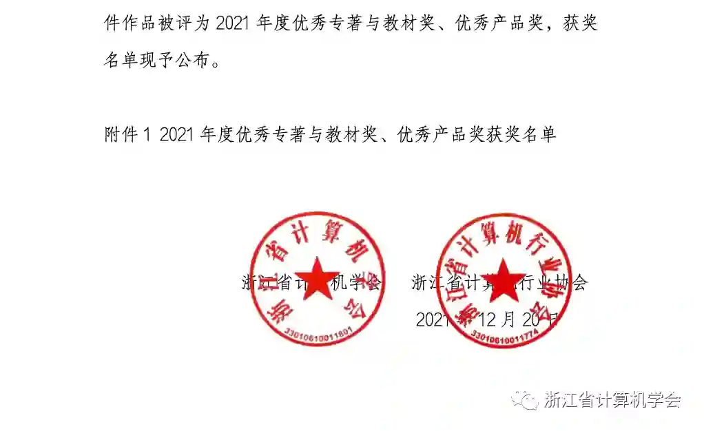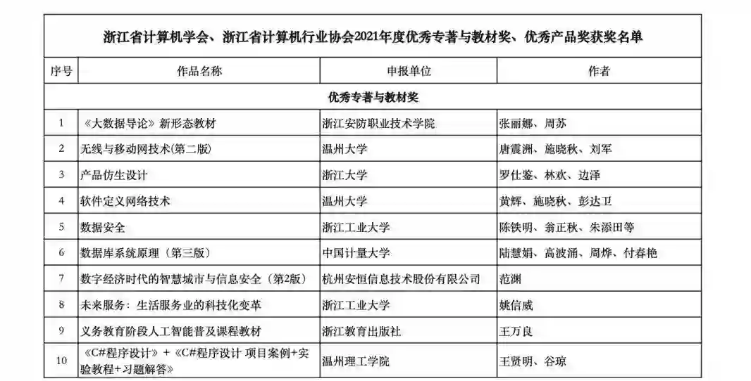 根据《浙江省计算机学会章程》《浙江省计算机行业协会章程》,经自主申请、材料审查、专家现场评审等程序,《大数据导论》新形态教材、《无线与移动网技术》第二版、“点石”智能篆刻软硬件服务一体化系统、“金智塔”隐私计算系统等22件作品被评为2021年度优秀专著与教材奖、优秀产品奖,获奖名单现予公布。