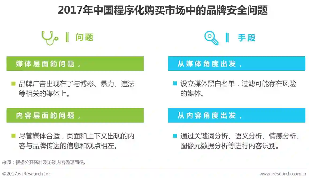 品牌安全是指,品牌所投放的广告出现在了不合适的媒体或内容中,让消费者产生不适、反感等负面情绪,从而影响到消费者对品牌的看法和态度,最终伤害品牌形象。在程序化购买过程中,尤其是RTB模式下,由于受众购买的特性,广告主很难决定投放媒体和内容,品牌安全面临更加突出的问题。为解决广告主面临的品牌安全问题,已经出现专业化的广告验证服务商,同时广告技术公司也都投入更多的精力到品牌安全保护中,而品牌安全的保护也有赖于与媒体的深度合作。