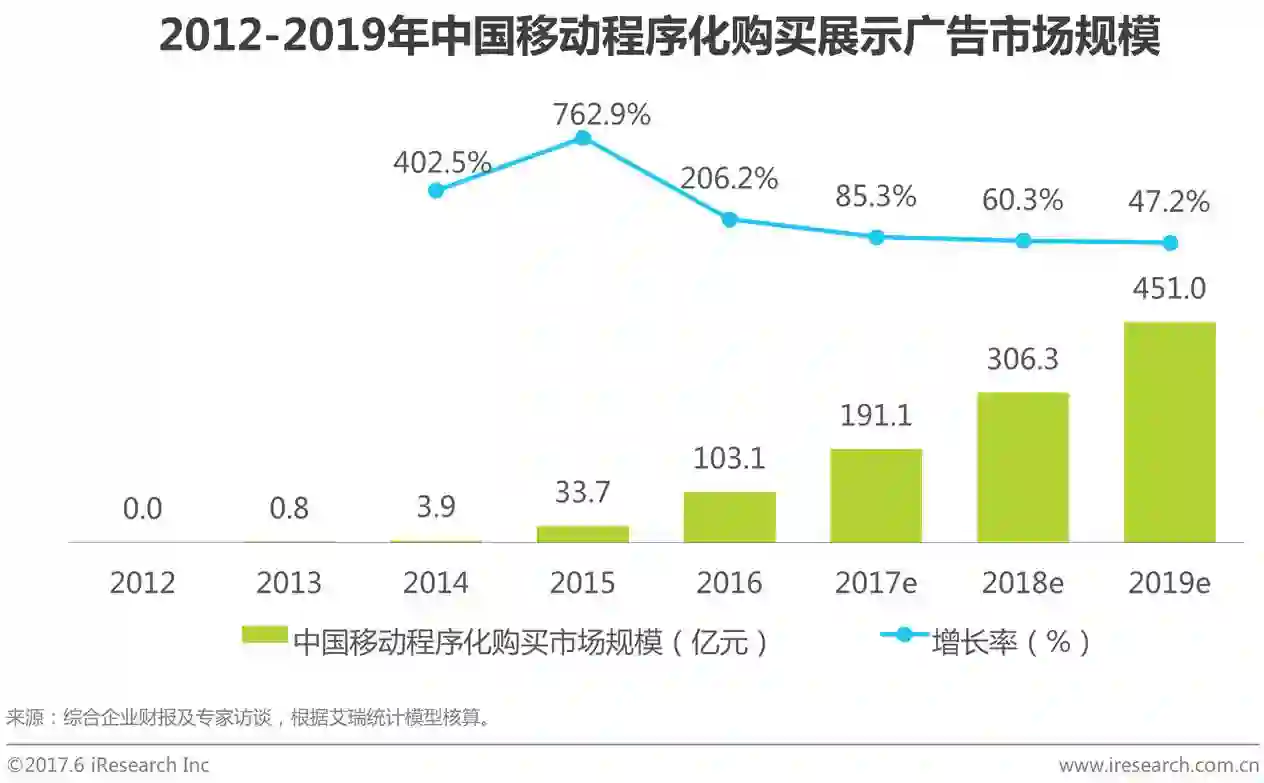2016年中国移动程序化购买展示广告市场规模在103.1亿,较2015年增长206.2%,预计到2019年,市场规模将达451.0亿。艾瑞分析认为,2015年起,移动程序化购买成为程序化购买市场增长的主要动力,未来三年内,移动程序化购买仍将维持相对高速增长,移动程序化购买市场的增速将明显高于整体市场。