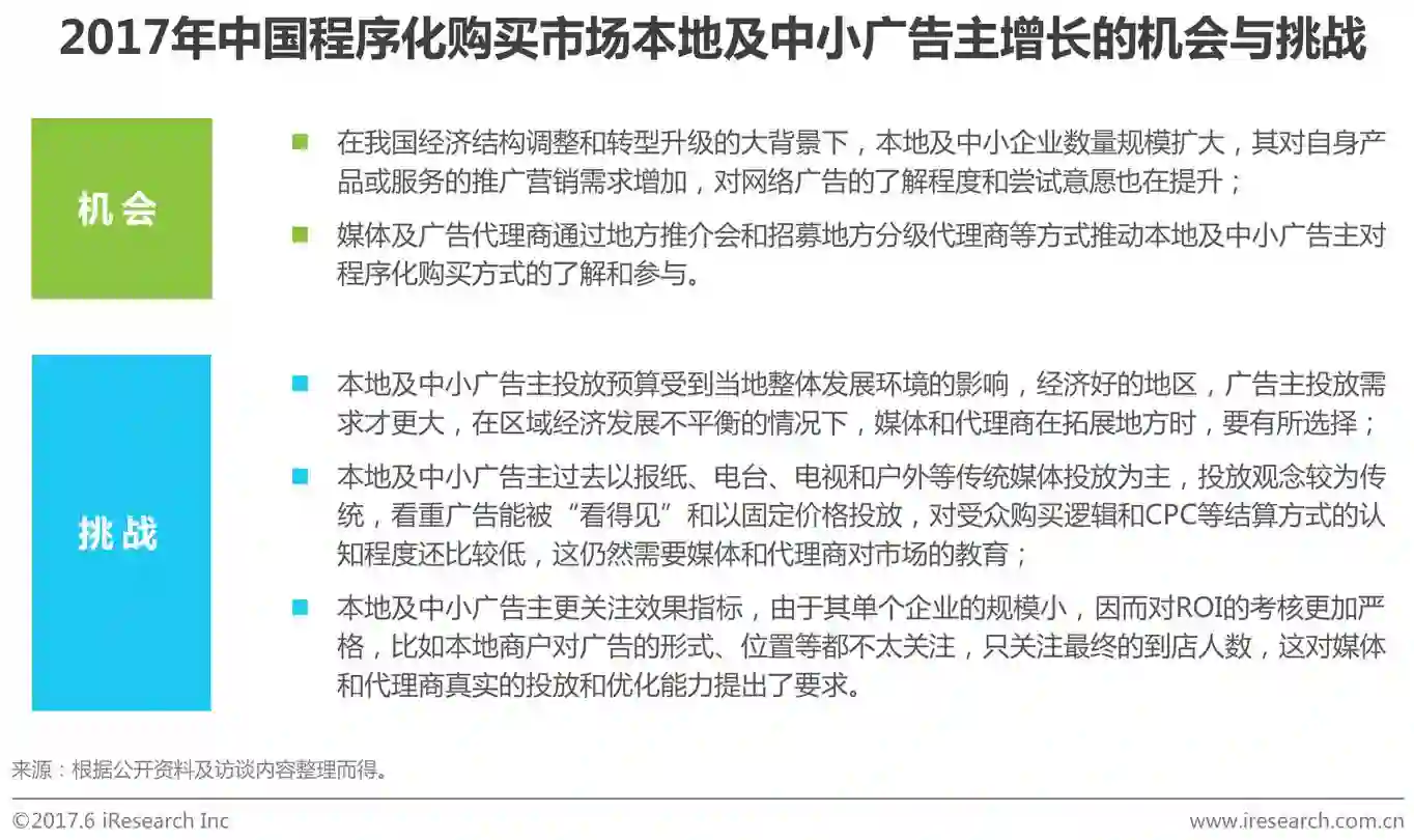 现阶段,程序化购买方式的广告主以快消、汽车、金融、房产等品牌广告主和电商、工具、游戏等互联网类广告主为代表,主要是因为这两类广告主投放网络广告的时间长、经验多,尝试新技术的意愿高、动力大。艾瑞分析认为,随着互联网用户及渠道的整体下沉,本地及中小广告主将成为程序化购买市场需求方中新的增长点,长期来看,这一势头将不会停止,但在短期内,也依然面临着区域经济发展水平不平衡、广告主认知程度较低等多重因素的挑战。