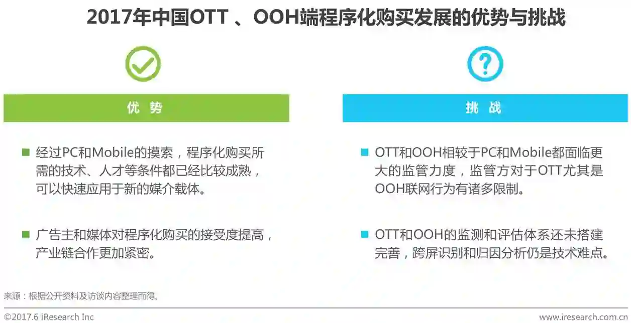 从媒介角度看,在程序化购买渗透PC端和Mobile端后,行业内的广告技术公司将OTT(Over the Top,智能电视)和OOH(Out of Home,户外)程序化视为新的增长点,OTT和OOH的程序化既有优势,也有不小的挑战。相较而言,OTT程序化进程更快,已经有一些实操性案例落地。艾瑞分析认为,包括OTT、OOH乃至VR等新的媒介载体实现程序化购买是大方向,然而,目前仍处在非常早期的阶段,从萌芽到开花结果,OTT至少还有两到三年的时间,而OOH则至少需要三到五年的时间,VR等则需要五到十年的时间。