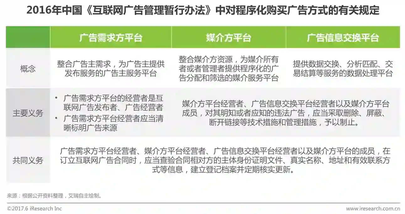 2016年9月1日,由国家工商行政管理总局公布的《互联网广告管理暂行办法》正式实行。在该暂行办法中,程序化购买首次进入监管视野,办法第十三、十四和十五条认可了程序化购买方式,并对程序化购买方式及产业链中广告需求方平台、媒介方平台和广告信息交换平台等主要角色的概念和义务做出了说明。艾瑞分析认为,这些规定实质上对程序化购买参与方设立了准入和参与门槛,通过对参与方主体的监管,解决过去市场中存在的权责不清等问题,程序化购买将由此逐步走向规范发展时代。