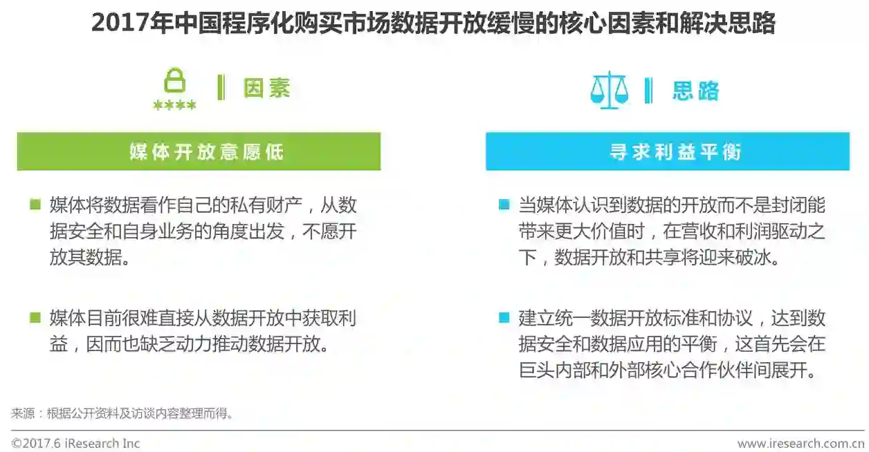 尽管第三方代理公司和广告主都在搭建DMP,但是由于媒体方数据量更大、维度更丰富、颗粒度更细,市场普遍期待媒体方数据的开放。目前,媒体更多是根据广告主及第三方代理公司的数据需求,回传数据结果。艾瑞分析认为,短期内,数据开放仍难有实质性动作,技术不是难点,找到各方角色之间的利益平衡点才是改变现状的关键。