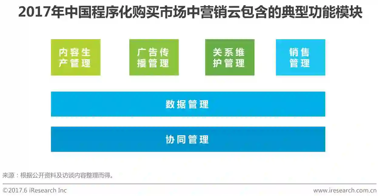 艾瑞分析认为,Mar-Tech的快速发展将推动营销云的落地,营销云应当包含内容生产管理、广告传播管理、关系维护管理、销售管理、数据管理、协同管理等六大管理模块。目前,每个管理模块上都有公司提供相应的产品和服务,而实现这些模块的有机结合,是未来营销云发展的重要方向。