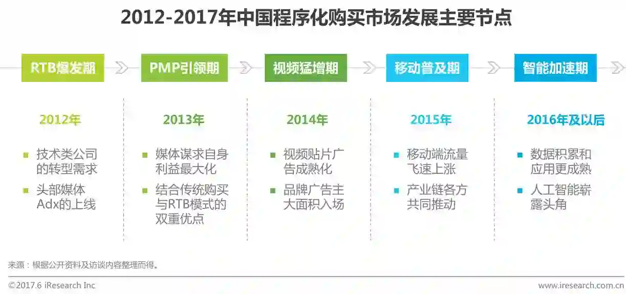 自2012年“程序化元年”起,程序化购买在中国落地已有五年。五年间,程序化购买受到资本的热烈追捧,上百家程序化购买平台涌现,先后经历RTB爆发期、PMP引领期、视频猛增期、移动普及期等四个关键发展节点。程序化购买这五年的发展,极大地发挥了技术和数据在广告投放中的重要作用,有效地提升了网络广告投放的效率和效果。