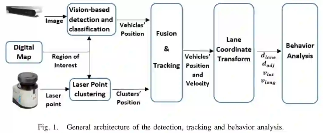 自动驾驶方面,作者展示了一种实时车辆检测及追踪的系统来实现诸如城市环境中驾驶行为分析的复杂任务。作者提出了一种结合了单目相机和2D Lidar的鲁棒的融合系统。该系统充分利用了以下3个关键的部分:使用深度学习技术的鲁棒的车辆检测,从Lidar获得的高精度距离数据,以及预先知道的道路环境。相机与Lidar传感器的融合,数据关联以及跟踪管理全部都在考虑了传感器的特征之后在全局地图坐标系上执行。