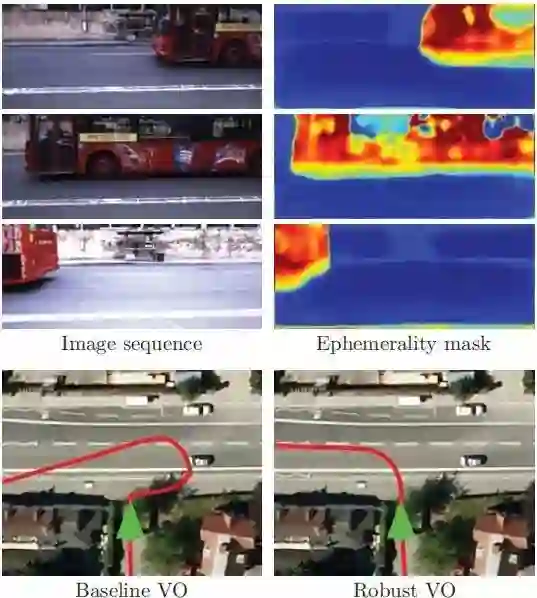 本文介绍了一种自监督学习遮挡的方法来提高城市环境中单目视觉里程计的鲁棒性。我们提出了一种可以忽略相机图像中“干扰物”的自监督方式,用来在杂乱的城市环境中更鲁棒地估计汽车的运动。我们利用离线的多场景建图的方法为每个输入的图片自动形成每个像素短暂的遮挡和深度地图,我们用它来训练深度卷积网络。在运行时,我们使用预测的短暂性和深度作为单目视觉里程计(VO)生成的输入,使用稀疏特征或者稠密的光度匹配。我们的方法仅使用一台相机即可产生公尺制的VO,即使动态、独立移动的物体遮挡了90%的图像信息,也可以恢复出正确的运动。