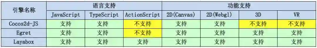 目前支持微信小游戏的引擎,有Cocos,Egret,Laya,我们先看下三者的功能比较: