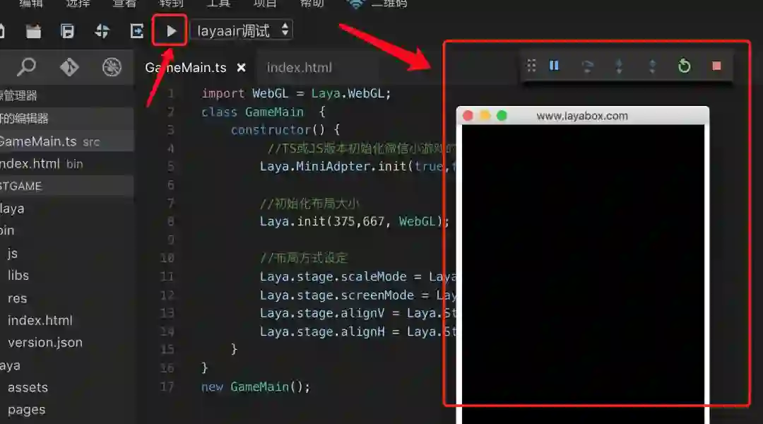 修改bin目录下的index.html ,删掉LayaUISample.ts的引用,改为下面的方式: