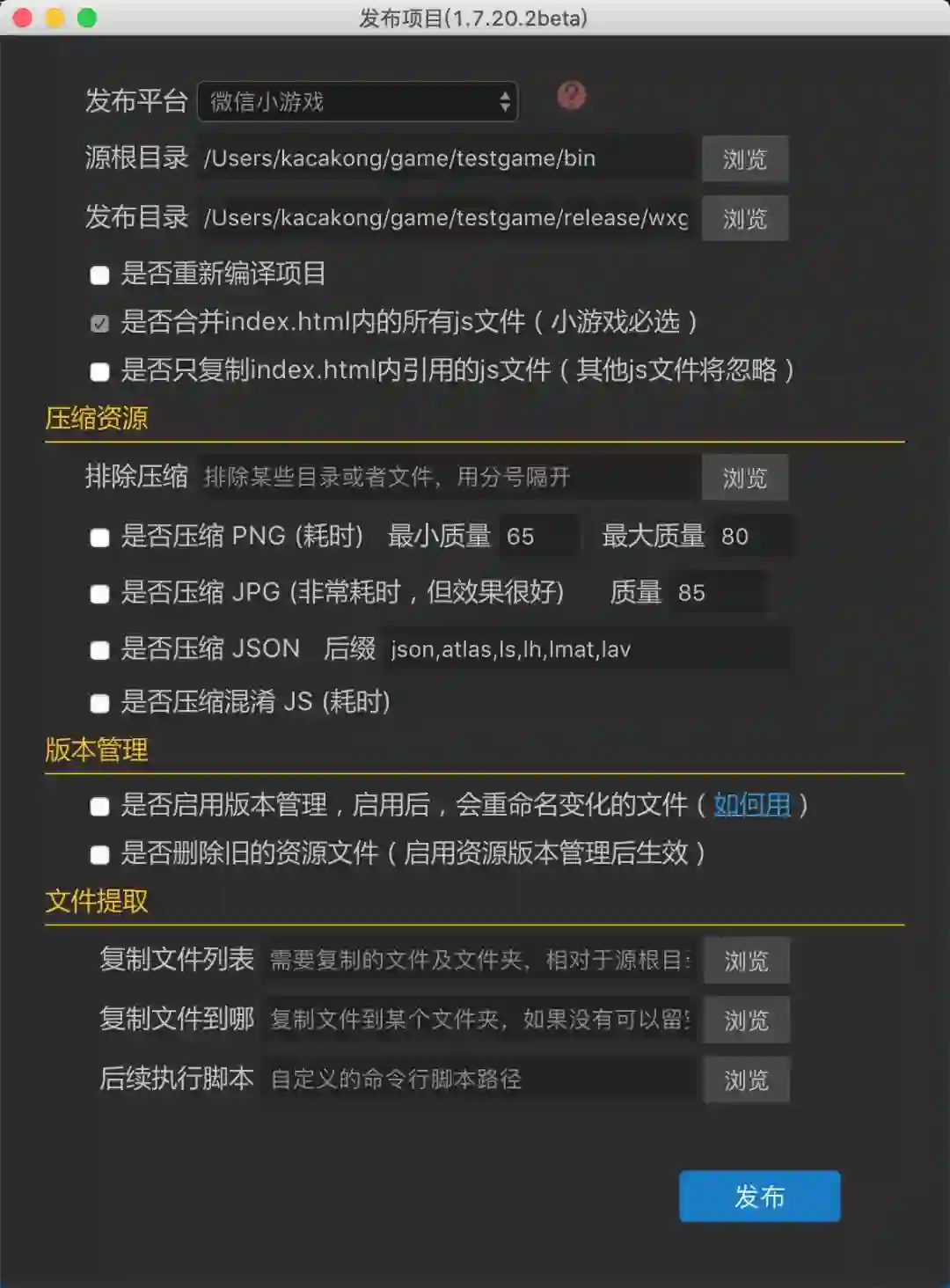 点击 进入发布界面,在发布平台选择“微信小游戏”,此时生成可以在微信开发者工具下运行的release/wxgame版本