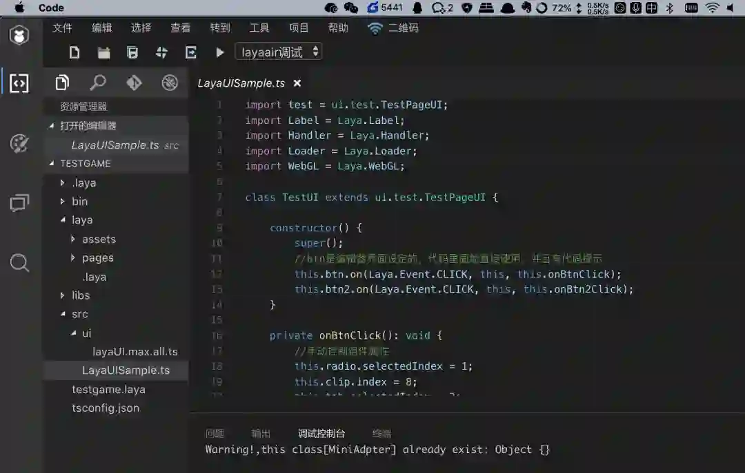 只是调试起来就有点蛋疼了,得Laya里写好,发布到release/wxgame,再在微信开发者工具里调试。