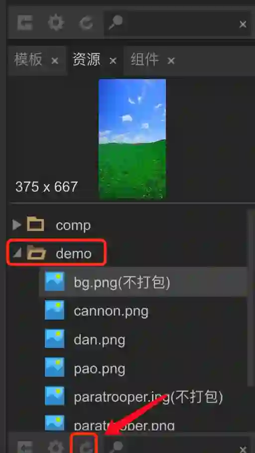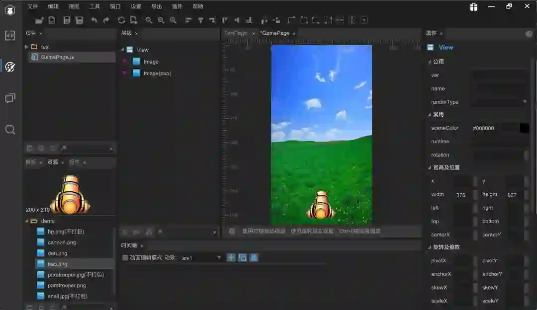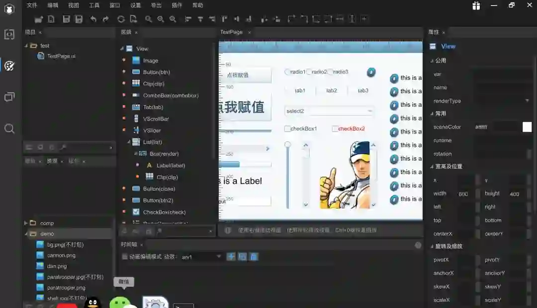 就是用来设计UI界面的地方,拖拖拽拽就可以把游戏页面整出来。Laya提供了好多组件,如果有需要的可以使用,当然也可以不用他的组件,自己搞自己的自定义组件。
