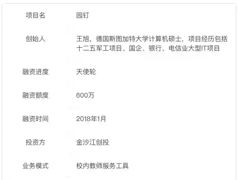 今年1月,“园钉”获得600万元天使轮投资,由金沙江创投投资。对于投资逻辑,据王旭介绍,投资方一方面看好这一市场的规模足够大且用户消费能力稳定,另一方面认为“园钉”这一产品并不需要学校资源推广是一巨大优势。据悉,“园钉”之前曾于2016年9月获得来自个人投资人的400万元种子轮投资。