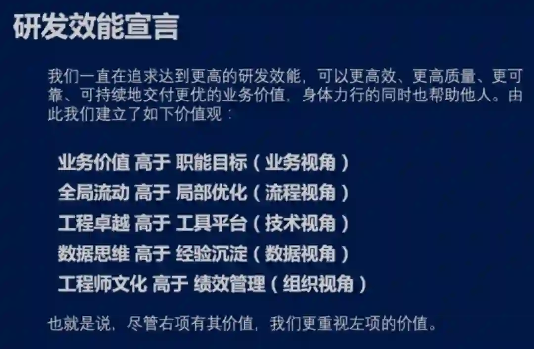 研发效能在国内尚处于快速发展阶段,许多专家和实践者在思路上具有很多共同观点,通过一些专项研讨,就提升研发效能的许多重要方面达成了一致。研发效能SIG希望能将这些沉淀的内容,纲挈领阐述专家和实践者的价值观,使其成为行业持续前进的催化剂。2021年业界发布了“研发效能宣言”,这既是对“敏捷宣言”的致敬,也是对信念和价值观的呼吁和声明,它说明了此行业领域专家和实践者的立场以及对研发效能而言的重中之重。以下是研发效能宣言的核心内容: