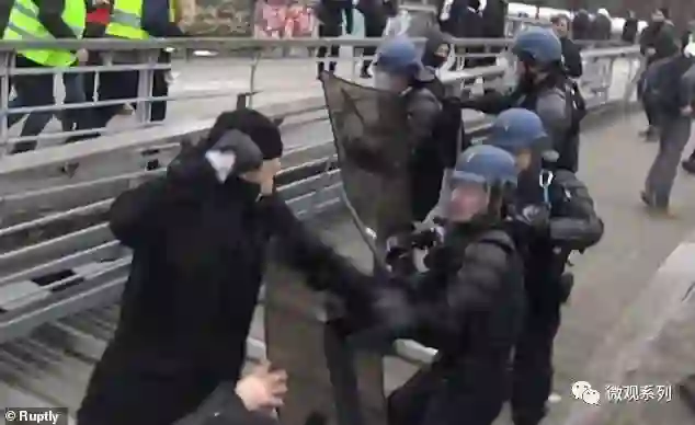 另外,在塞纳河畔的一座桥上,一位戴着职业拳击手套的暴民,带着一群人冲向镇暴警察。