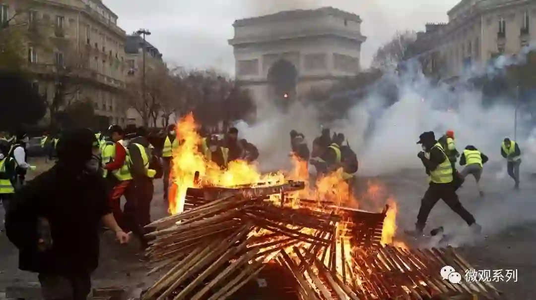他们和军警对峙,同时也打砸商铺,焚烧汽车,更有甚者,爬上了代表法国象征的凯旋门进行破坏。