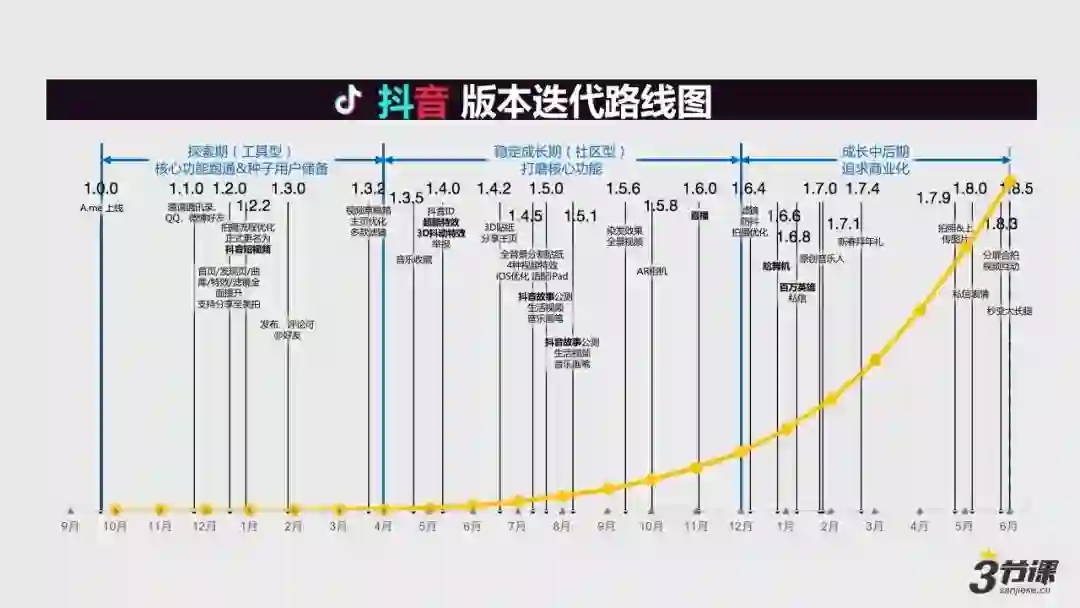 但,在今天的官方数据发布之前,其实在三节课产品P2课程内,就已经有同学做过抖音的产品增长曲线和趋势的分析,如下图。