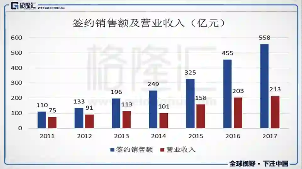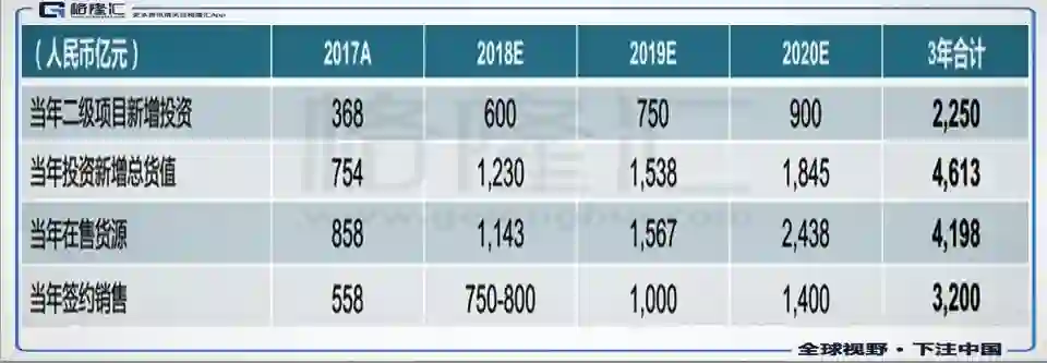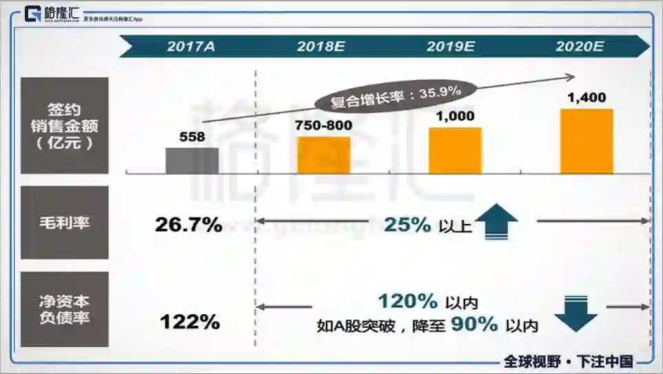 更重要的是,在业绩发布后,管理层发表了三年发展计划:“未来三年合计目标签约金额3200亿元,复合增长率35%以上。2018-2020年实现800亿、1000亿、1400亿的签约目标,同时控制毛利率在25%以上的水平,净负债率在120%以内,若回A股能突破,有望控制在90%水平。