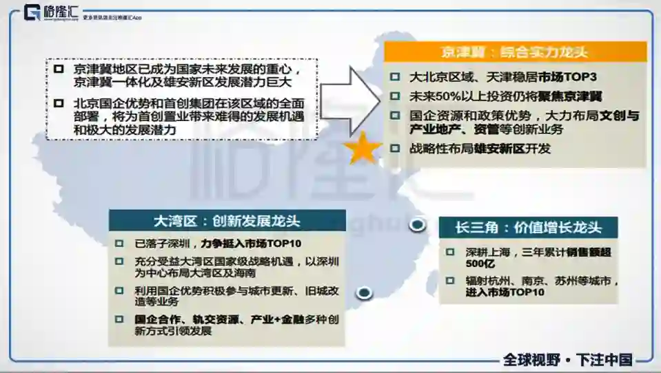 为实现公司规模的快速扩张,首创置业从过去的聚焦五大单核城市(北京、天津、上海、成都、重庆)升级为聚焦京津冀、长三角、粤港澳大湾区三大城市群。其中北京作为大本营,未来京津冀城市群仍是公司发展的绝对核心,占公司未来投资的50%以上。
