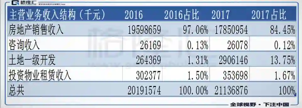 从营收的构成看,房地产销售收入占主要比重,其次是土地一级开发。2017年土地一级开发收入同比增长近1000%,原因是2017年天津武清项目进入收获期,而房地产销售收入略微下降主要是结转周期影响。