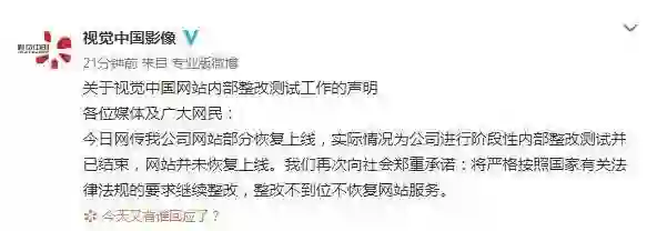 4月21日消息,有媒体报道视觉中国PC端网站已经小范围恢复上线。对此,视觉(中国)文化发展股份有限公司微信公众号发布声明,称实际为公司进行阶段性内部整改测试并已结束。网站并未恢复上线。