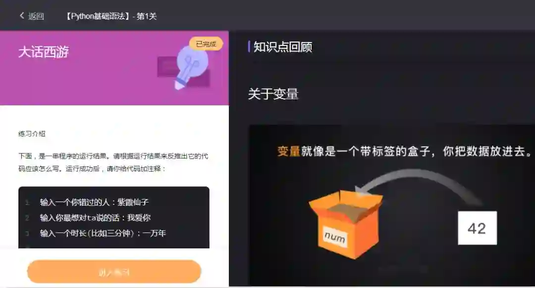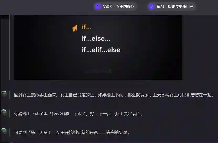 「Python小课」致力于消除编程专属于程序员的错误认知,区别于传统的编程学习,不用看书,不用看视频;「Python小课」采用了交互式设计,穿插趣味横生的场景,让你越学越上瘾。