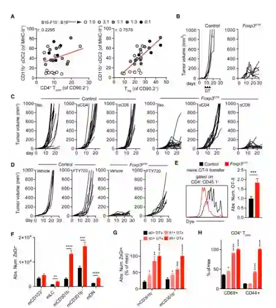 我们知道,肿瘤患者的外周血及肿瘤局部往往可以找到调节性T细胞(Treg细胞)的踪迹,有研究证实Treg细胞能够抑制免疫应答,因此研究人员猜想Treg细胞或许正是阻滞CD4+T细胞激活的元凶。研究人员去除了实验肿瘤小鼠体内的Treg细胞,发现cDC2可顺利迁移至肿瘤区域,同时小鼠的抗肿瘤免疫反应明显加强,而且他们证实这种免疫反应是依赖于CD4+T细胞产生的Treg细胞。
