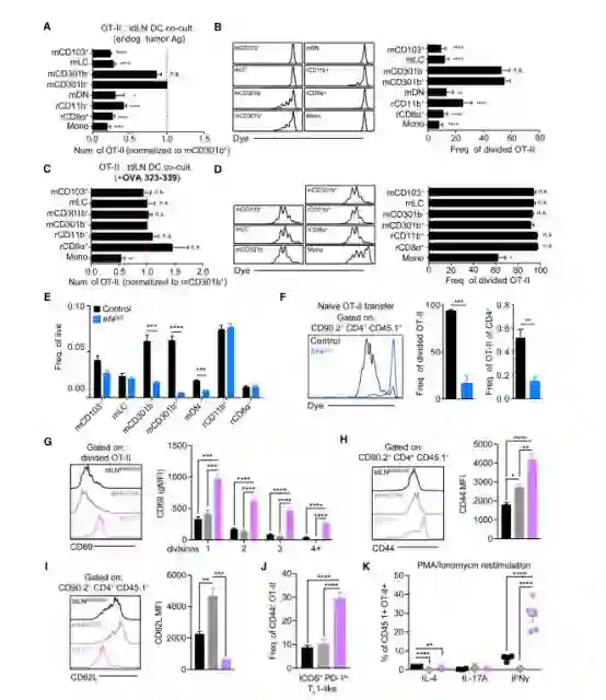 研究人员对接种B16肿瘤的小鼠淋巴结中的髓系细胞进行了单细胞测序,发现迁移性cDC2亚群可以根据CD301b分子的有无分为两个不同亚群。后续增殖实验则证实了CD301b+/- cDC2亚群引发了初始CD4+T细胞的增殖。也就是说,cDC2是CD4+T细胞有效激活的关键。那是否意味着提高肿瘤微环境中的cDC2的比例,就能有效提高CD4+T细胞的抗肿瘤免疫效果?实验结果显示,如果仅仅提高cDC2比例,cDC2无法迁移至肿瘤区域,而且激活的CD4+T细胞并没有因此分化增加!抗肿瘤反应也停滞不前!这就意味着,应该还存在着可以“抗衡”cDC2的另一要素,是什么呢?