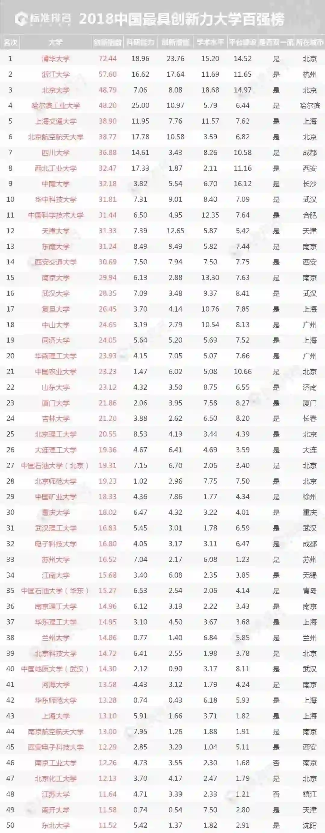 在此基础上,得出了“2018中国最具创新力大学百强榜”。其中,清华大学、浙江大学、北京大学、哈尔滨工业大学、上海交通大学、北京航空航天大学、四川大学、西北工业大学、中南大学、华中科技大学位列榜单前十名。百强高校详细排名如下: