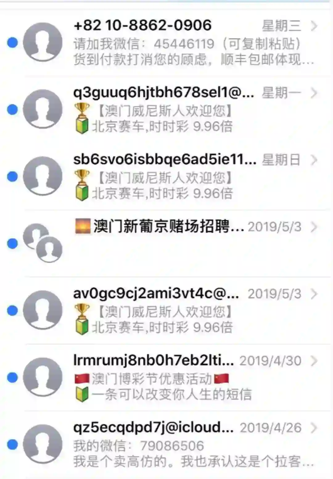 “以前每周一、二条,现在是每天都会收到博彩信息。”有读者向懂懂笔记吐槽称,通过iMessage收到的非法博彩信息里,有不少显示是海外手机号,还有部分显示为乱码outlook邮箱。