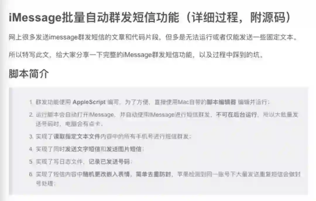 懂懂笔记在搜索引擎上搜索“iMessage群发”,找到了不少相关的技术贴。而在某IT技术社区,不少相关内容甚至详尽提供了Apple 编写的群发代码与教程。