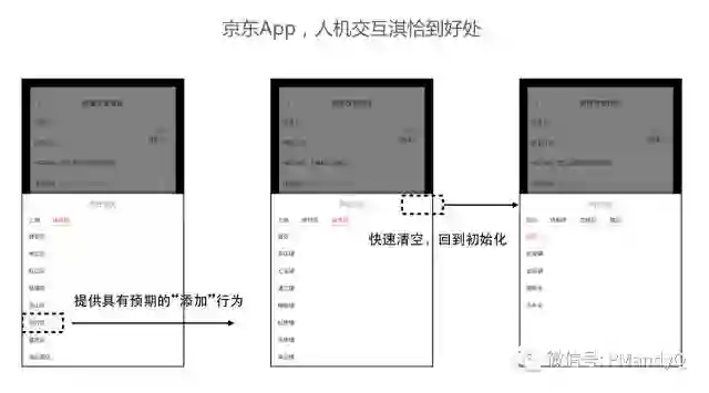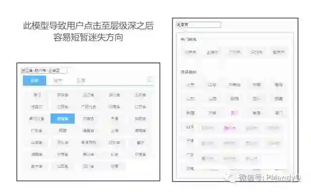 举例:京东App,发货地址选择地区时的交互流程,操作及反馈值得推荐,选中一层(省、市、区)则顺其自然的进入下一层选择,给人新增一条记录待添加的感觉,操作一气呵成。相反对比,把省、市、区作为Tab的Title的方式,让用户选择Tab,然后选择内容的方式。此交互体验更佳顺畅,且能解决用户点击层级深之后,短暂迷失方向的难题。
