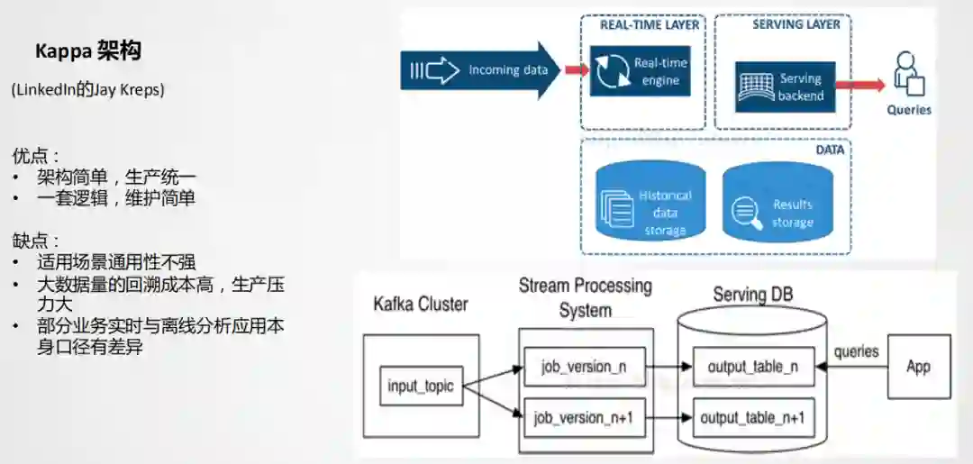 双路生产会存在一些问题,比如加工逻辑double,开发运维也会double,资源同样会变成两个资源链路。因为存在以上问题,所以又演进了一个Kappa架构。