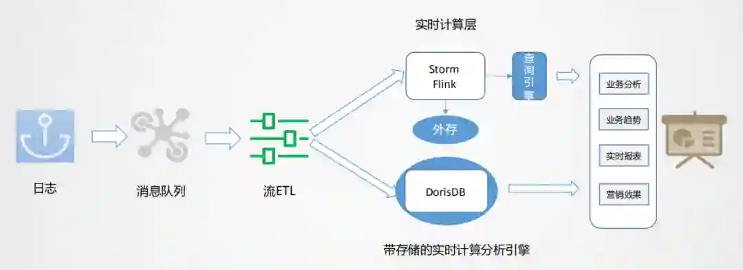 实时OLAP怎么实现?有没有一种自带存储的实时计算引擎,当实时数据来了之后,可以灵活的在一定范围内自由计算,并且有一定的数据承载能力,同时支持分析查询响应呢?随着技术的发展,目前MPP引擎发展非常迅速,性能也在飞快提升,所以在这种场景下就有了一种新的可能。这里我们使用的是Doris引擎。