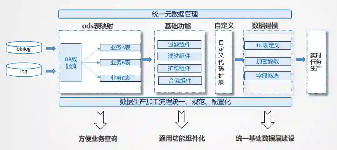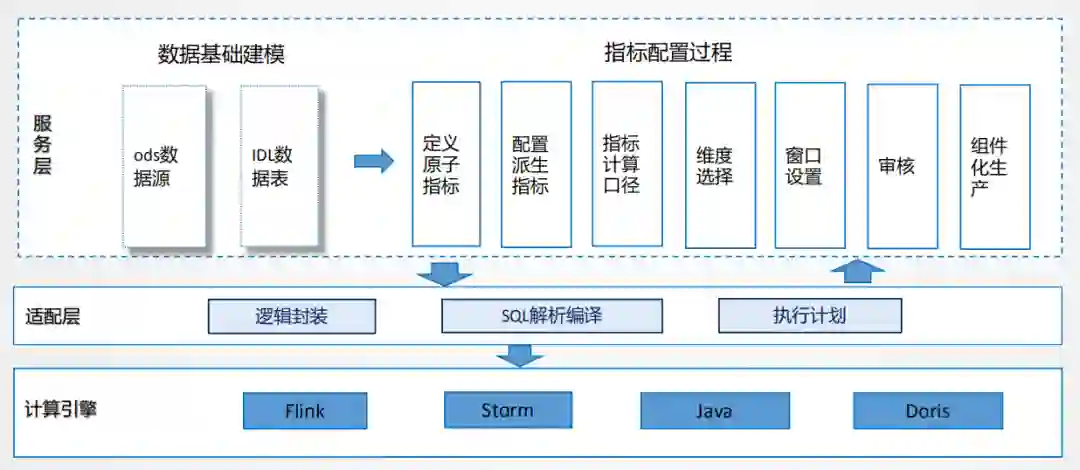 在功能层面,把指标管理的思想融合进去,原子指标、派生指标,标准计算口径,维度选择,窗口设置等操作都可以通过配置化的方式,这样可以统一解析生产逻辑,进行统一封装。