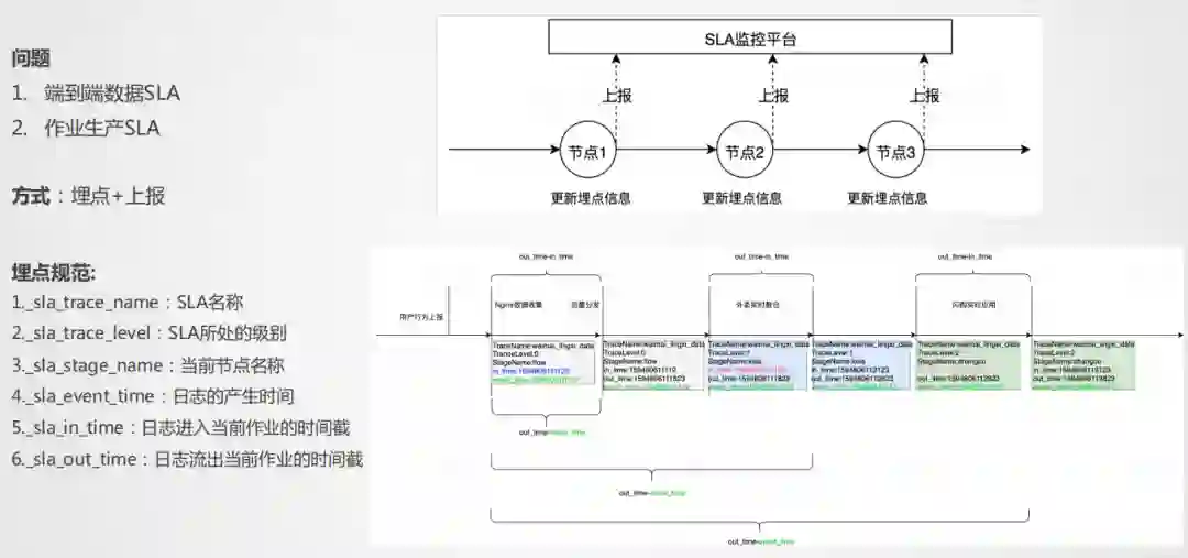 SLA主要解决两个问题,一个是端到端的SLA,一个是作业生产效率的SLA,我们采用埋点+上报的方式,由于实时流比较大,埋点要尽量简单,不能埋太多的东西,能表达业务即可,每个作业的输出统一上报到SLA监控平台,通过统一接口的形式,在每一个作业点上报所需要的信息,最后能够统计到端到端的SLA。