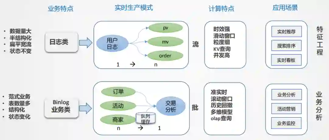 如上图所示,数据从日志统一采集到消息队列,再到数据流的ETL过程,作为基础数据流的建设是统一的。之后对于日志类实时特征,实时大屏类应用走实时流计算。对于Binlog类业务分析走实时OLAP批处理。