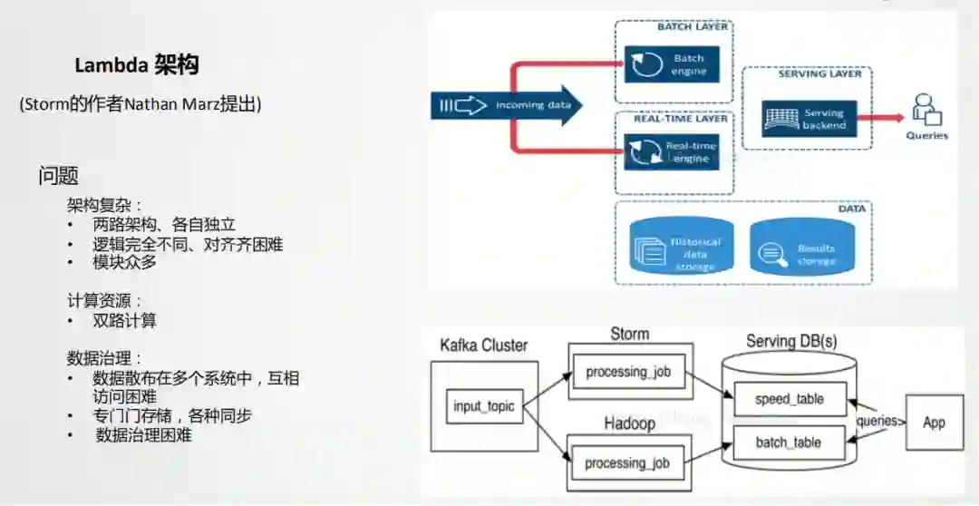 Lambda架构是比较经典的架构,以前实时的场景不是很多,以离线为主,当附加了实时场景后,由于离线和实时的时效性不同,导致技术生态是不一样的。Lambda架构相当于附加了一条实时生产链路,在应用层面进行一个整合,双路生产,各自独立。这在业务应用中也是顺理成章采用的一种方式。