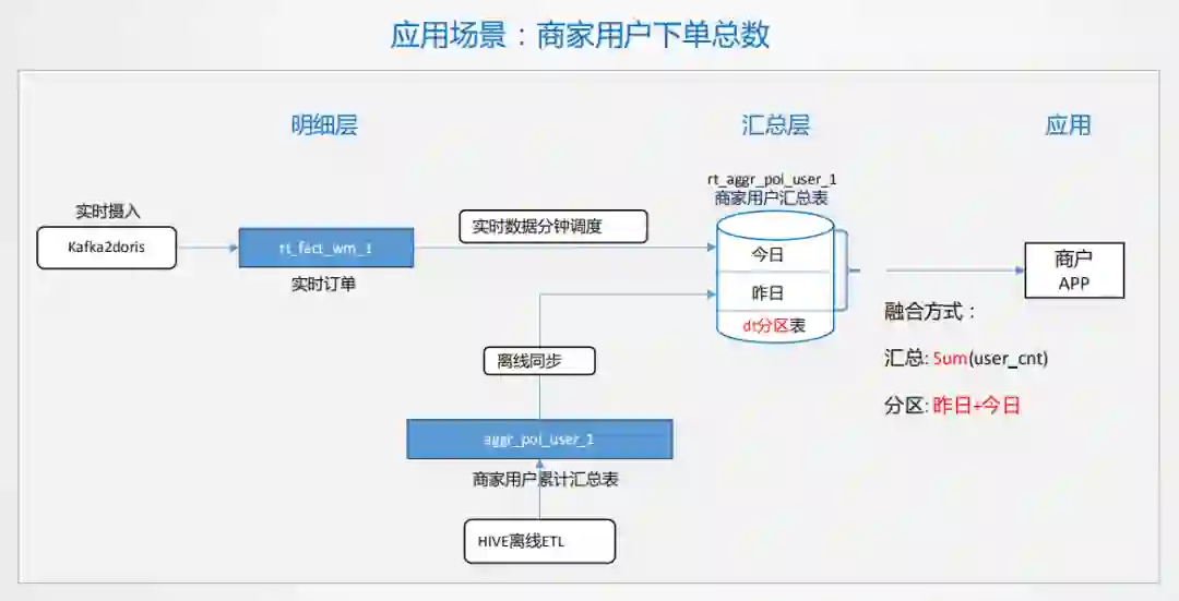 最后通过一个案例说明,比如商家要根据用户历史下单数给用户优惠,商家需要看到历史下了多少单,历史T+1的数据要有,今天实时的数据也要有,这种场景是典型的Lambda架构,可以在doris里设计一个分区表,一个是历史分区,一个是今日分区,历史分区可以通过离线的方式生产,今日指标可以通过实时的方式计算,写到今日分区里,查询的时候进行一个简单的汇总。