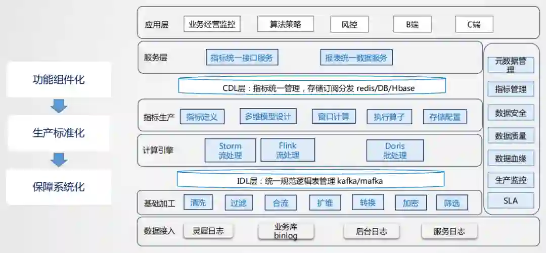首先进行功能的抽象,把功能抽象成组件,这样就可以达到标准化的生产,系统化的保障就可以更深入的建设,对于基础加工层的清洗、过滤、合流、扩维、转换、加密、筛选等功能都可以抽象出来,基础层通过这种组件化的方式构建直接可用的数据结果流。这其中会有一个问题,用户的需求多样,满足了这个用户,如何兼容其他的用户,因此可能会出现冗余加工的情况,从存储来讲,实时数据不存历史,不会消耗过多的存储,这种冗余是可以接受的,通过冗余的方式可以提高生产效率,是一种空间换时间的思想应用。