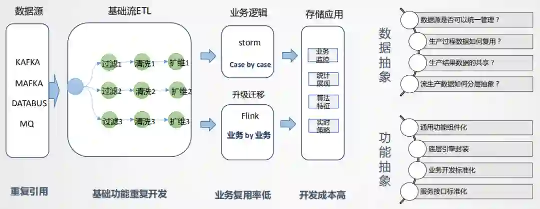 如上图所示,拿到数据源后,会经过数据清洗,扩维,通过Storm或Flink进行业务逻辑处理,最后直接进行业务输出。把这个环节拆开来看,数据源端会重复引用相同的数据源,后面进行清洗、过滤、扩维等操作,都要重复做一遍,唯一不同的是业务的代码逻辑是不一样的,如果业务较少,这种模式还可以接受,但当后续业务量上去后,会出现谁开发谁运维的情况,维护工作量会越来越大,作业无法形成统一管理。而且所有人都在申请资源,导致资源成本急速膨胀,资源不能集约有效利用,因此要思考如何从整体来进行实时数据的建设。